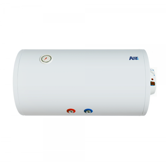 Водонагрівач накопичувальний Arti, потужністю 2000 ВТ з мокрим теном, обладнаний баком 100 літрів, з антикорозійним склокерамічним титановим покриттям. горизонтального монтажу з механічним керуванням та зовнішнім терморегулятором. Розміри-440х945х440 мм.