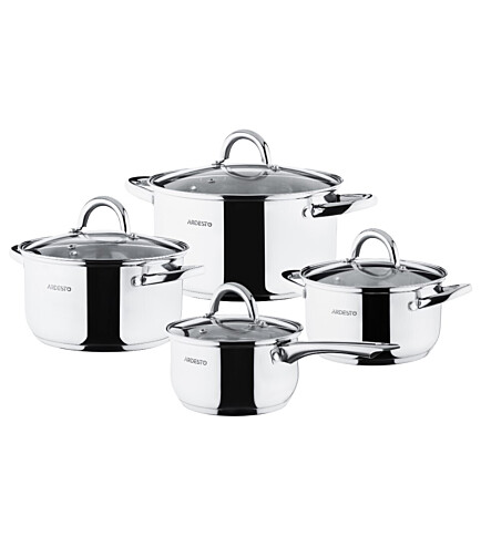 Комплектація: стітник на 1,8 літрів, з кришкою; Каструля на 2,5 літрів, з кришкою; Каструля на 3,4 літрів, з кришкою; Каструля на 5,8 літрів з кришкою.